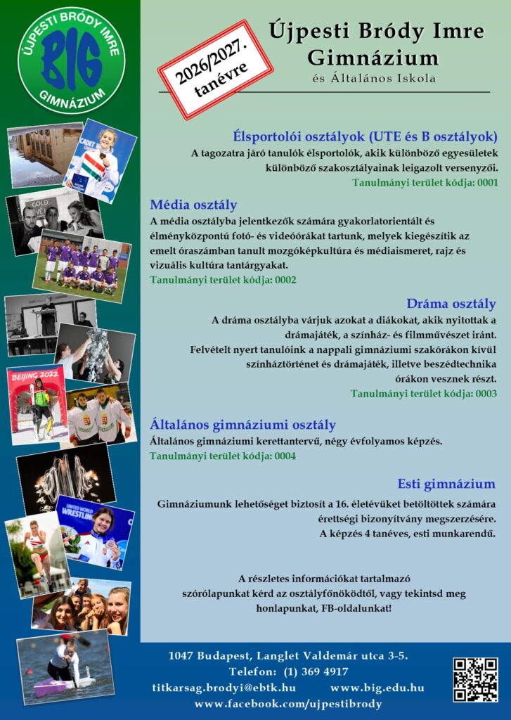 Tisztelt Szülők! Az Újpesti Bródy Imre Gimnázium és Általános Iskola a 2025/2026. tanévben zajló középfokú felvételi eljárására vonatkozó információit az alábbi dokumentumok tartalmazzák. Amennyiben kérdésük merülne fel, vegyék fel velünk a kapcsolatot: |