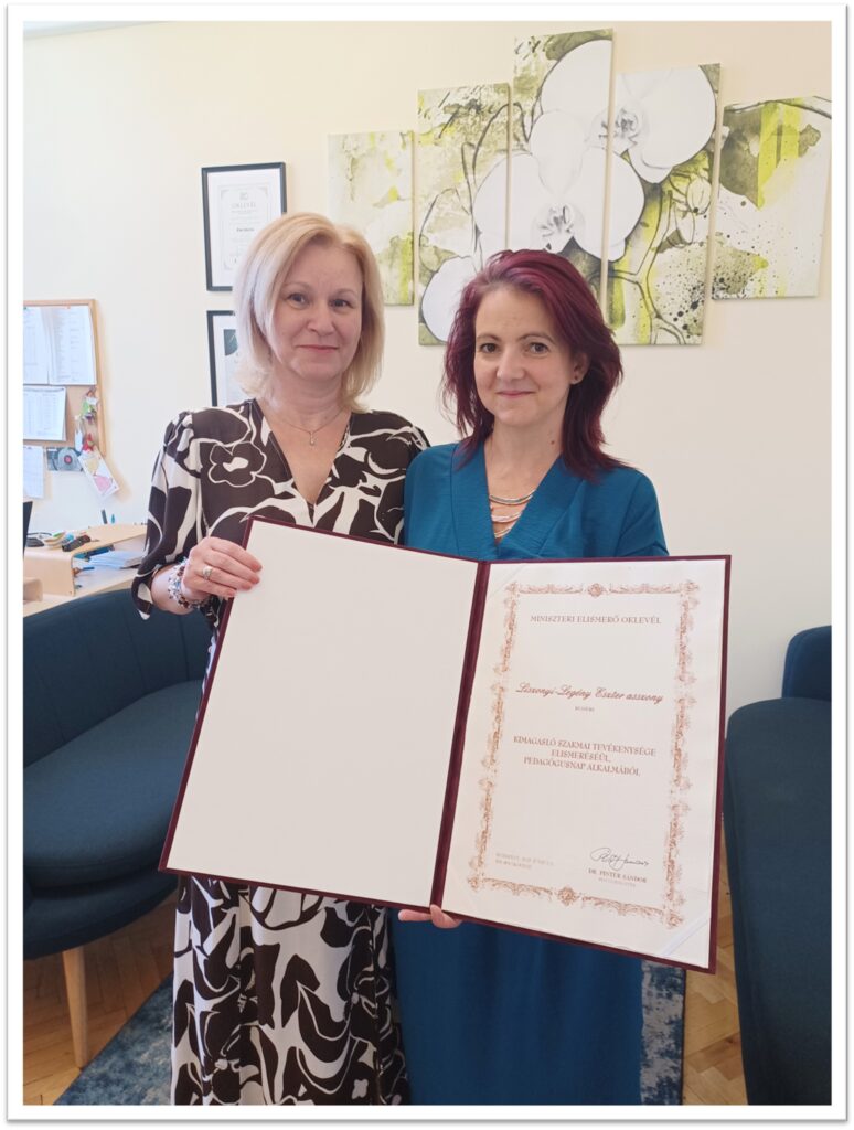 Kimagasló szakmai tevékenysége elismeréseként Liszonyi-Legény Eszter tanárnő Miniszteri Elismerő Oklevelet vehetett át Ilauszkyné Varga Enikő főigazgató asszonytól a 2024/2025. évi tanév zárultával.